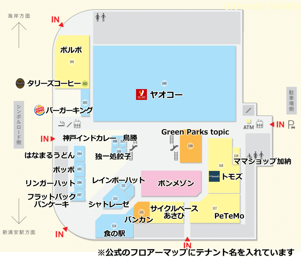 1階フロアマップを見ていきましょう。1階の半分はスーパーマーケットの『ヤオコー』が占めます。イトーヨーカドー時代とほぼ同じ場所がスーパーになる形になります。