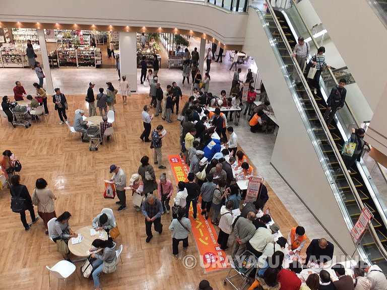 懐かしさ感じる、吹き抜けのエスカレーターを上がると2階のテナントが見えてきます。下を覗くとヤオコーのポイントカード入会受付が行われていました。当日からポイントを貯められるそうです。混んでいるのがちょっと…という人は、後日自宅でも入会できるそうですよ。