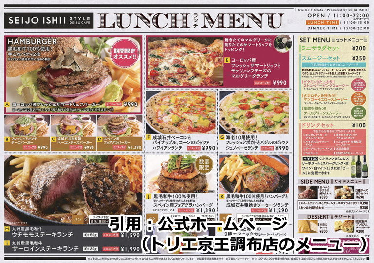 成城石井トリエ京王調布のメニューを参考までに見ていきましょう。メニューからしても、本格的な食事が楽しめそうですね。更に詳しくは、成城石井トリエ京王調布のホームページをご覧ください。ディナーやドリンクメニューもあります。
