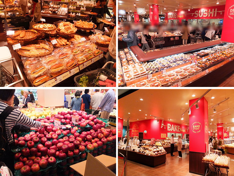 ここからは、ちょっとダイジェスト風に、いい香りの種類豊富なパンが揃えてあったり、個人的にお勧め超美味しいヤオコー惣菜に目移りしたり、そうそう、どんどんカゴに入っていた美しいリンゴ。開店直後のベーカリーも。